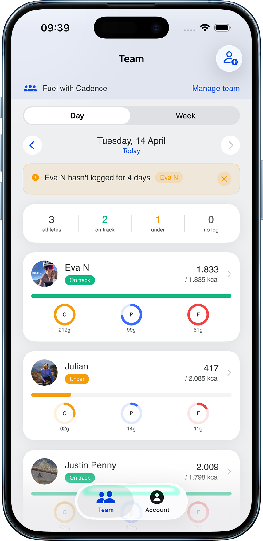See what every athlete is eating, against their targets, as they log it. On your phone or in the web dashboard.
